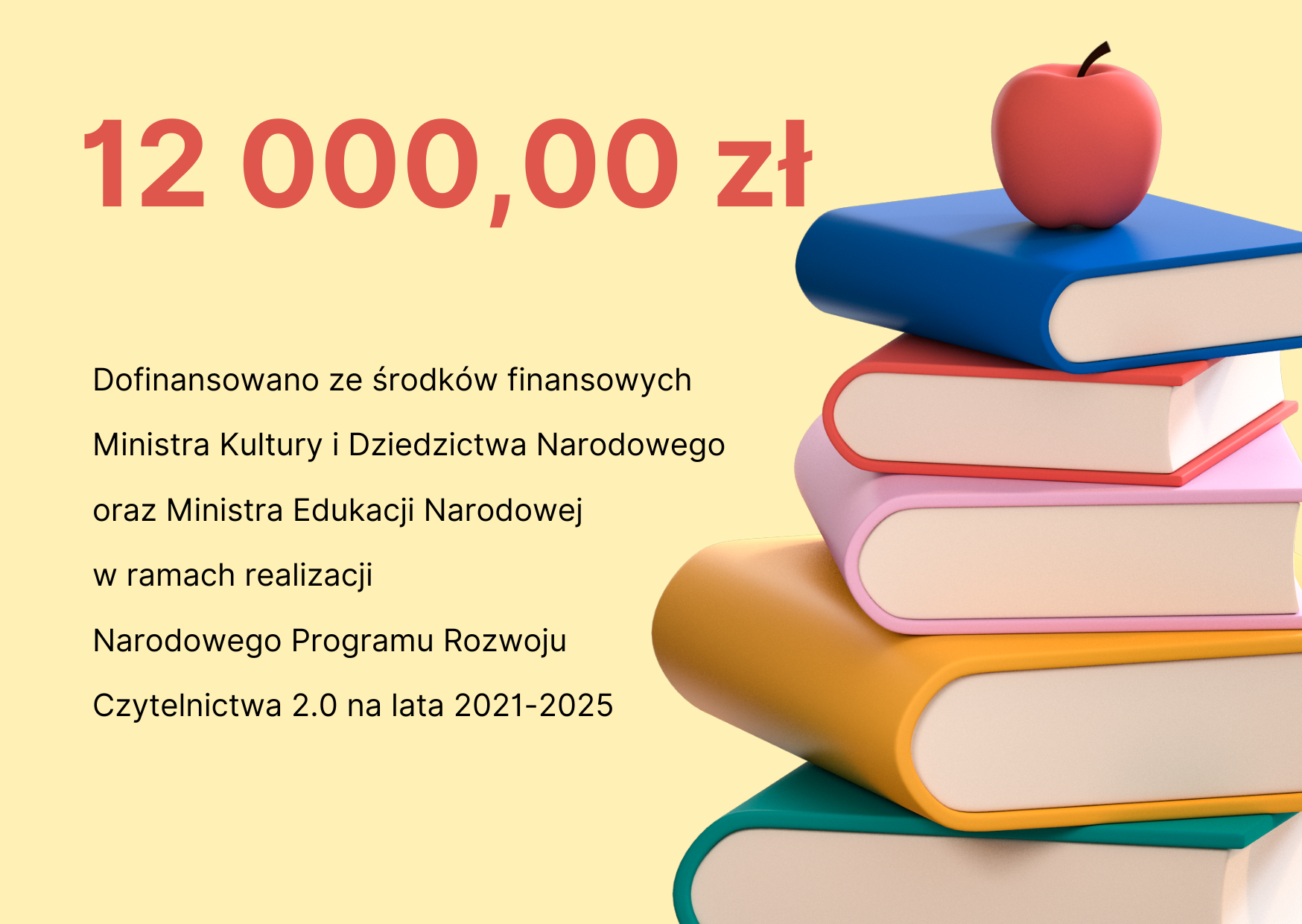 Narodowy Program Rozwoju Czytelnictwa 2.0, z przeznaczeniem na zakup książek będących nowościami wydawniczymi i niebędoncych podręcnikami, w szczególności książek historycznych w tym poświęconych historii Polski XX w. oraz lektur szkolnych (nowych, elementów wyposażenia do biblioteki szkolnej) realizację działań promujących czytelnictwo - Priorytet 3, w ramach NPRCz 2.0 na lata 2021-2025.
